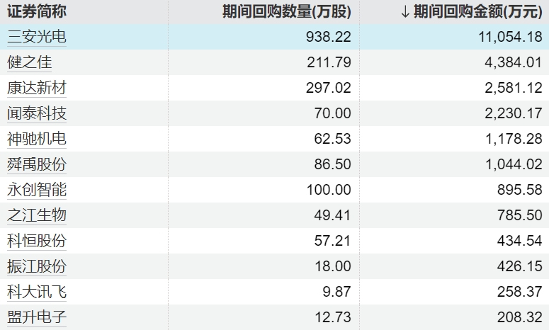 12家上市公司股票获回购配资炒股开户,三安光电回购金额最高12家上市公司股票获回购,三安光电回购金额最高