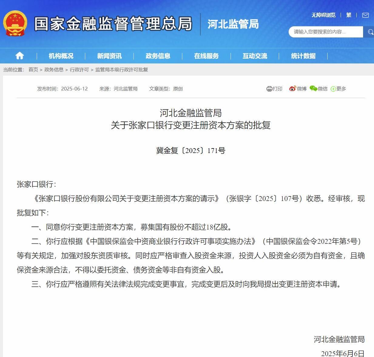 6 月 12 日消息,河北金融监管局发布《关于张家口银行变更注册资本方案的批复》(冀金复〔2025〕171 号)。批复显示配资平台查询,同意张家口银行变更注册资本方案,募集国有股份不超过 18 亿股。